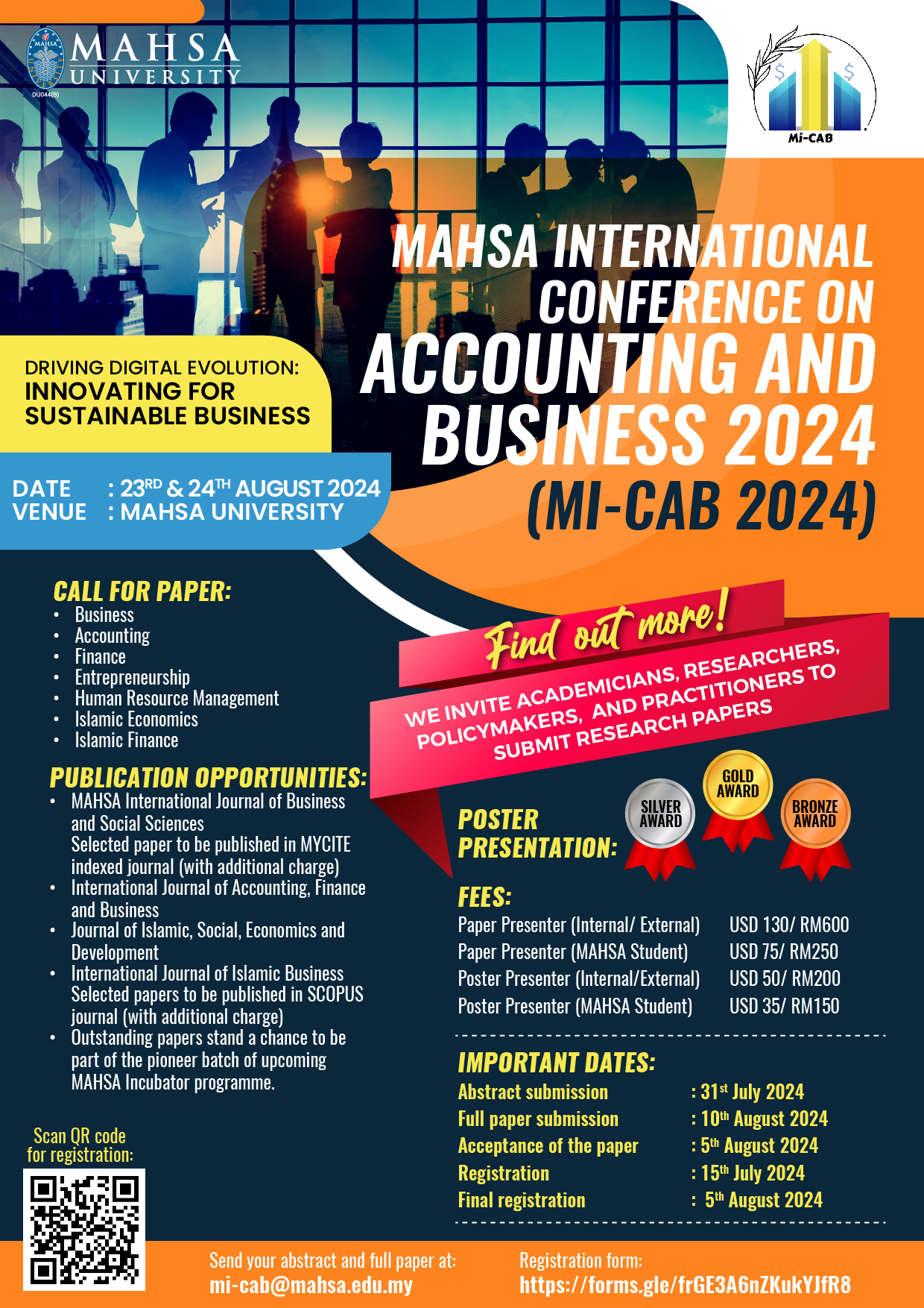 • All accepted and presented papers will be published in: MAHSA International Journal of Business and Social Sciences (Mi-JBSS)