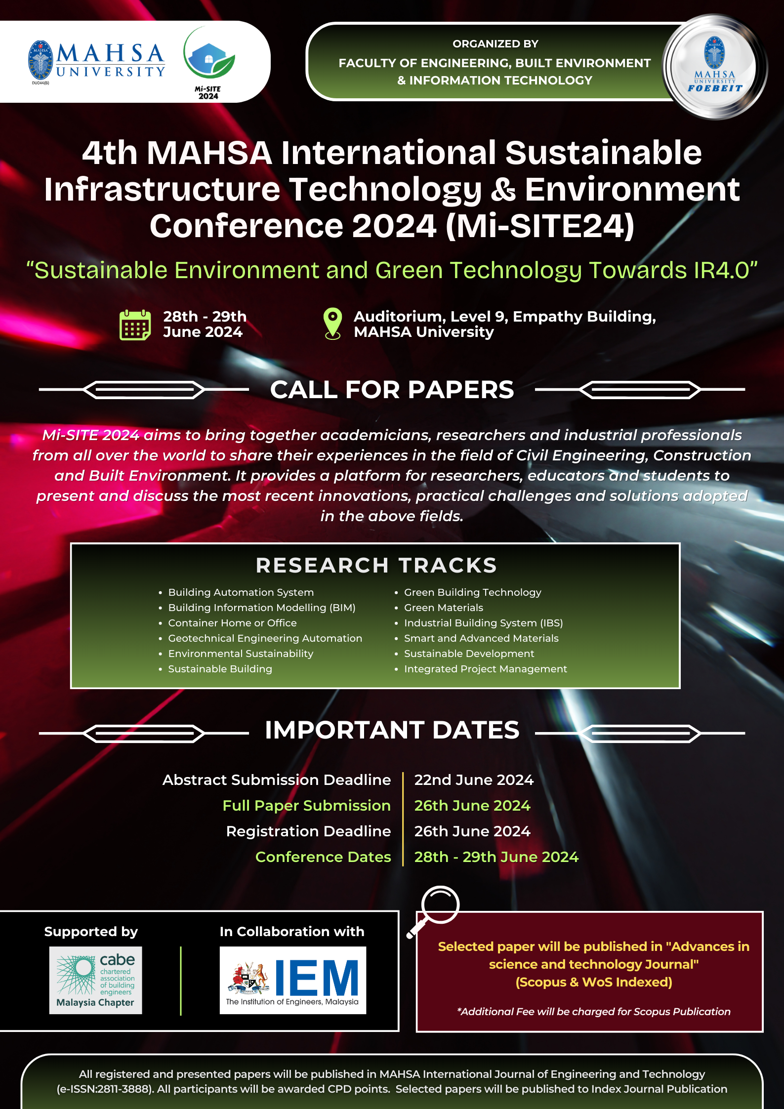 Mi-SITE 2024 aims to bring together academicians, researchers and industrial professionals from all over the world to share their experiences in the field of Civil Engineering, Construction and Built Environment. It provides a platform for researchers, educators and students to present and discuss the most recent innovations, practical challenges and solutions adopted in the above fields.